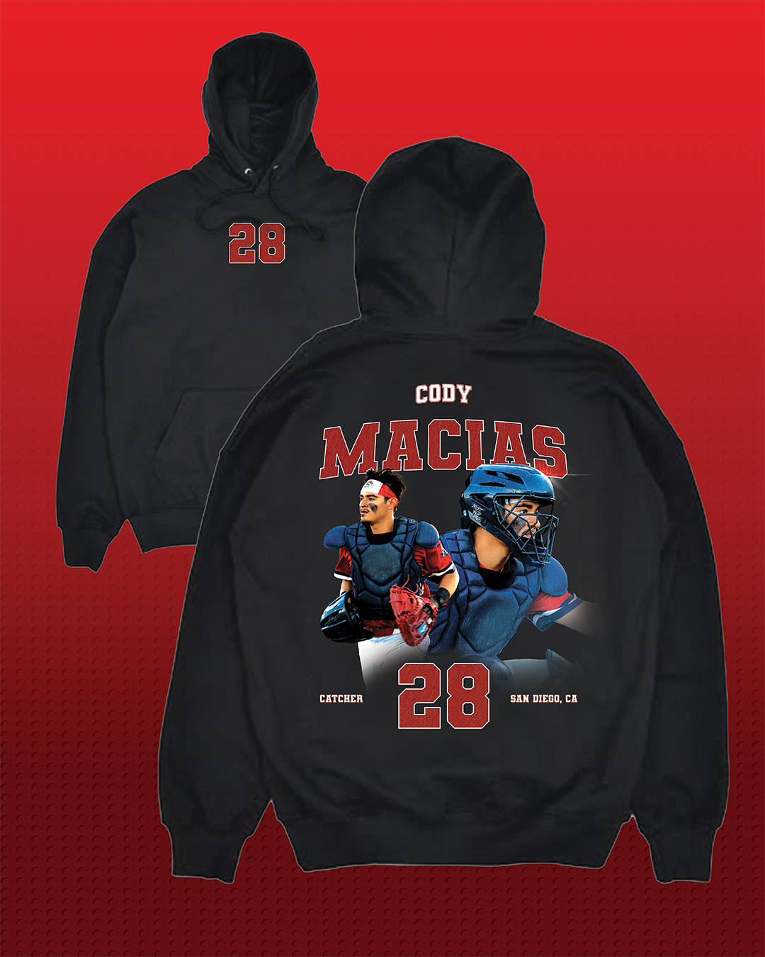 Show your support for Cody Macias, a catcher from San Diego, California, now making his mark in Pueblo, Colorado, with the Cody Macias #1 FAN Hoodie. Built for comfort and everyday wear. Featuring bold graphics on the back and Cody's number, it’s the perfect piece for fans repping him on game day and beyond.